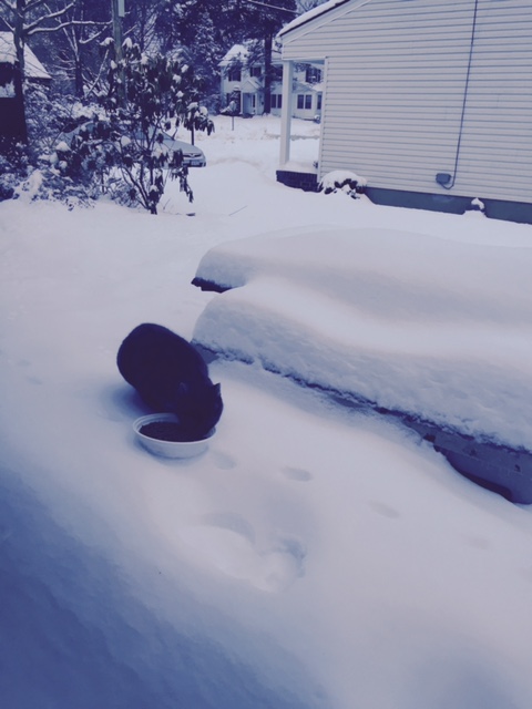 Many days, my kids and I stared through the glass doors peering out in the frosty night wondering if Jeffy would make it. At times, the snow was so high he was almost just a head. Other days he carefully careened the mountains of crunchy ice to reach us. Every time he did we cheered and I peppered his dish with fresh chicken or juice from the tuna can. It seemed so unlikely he’d survive the single digit temps and crippling wind, but storm after storm, we’d spy those little foot (and body) imprints in the snow. Somehow against all odds he’d make it to our door.
